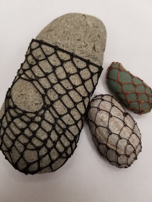 Netting can shape and curve around most any form. Stop by and experiment with this new technique around small objects, learn to make pouches, and explore other possibilities.